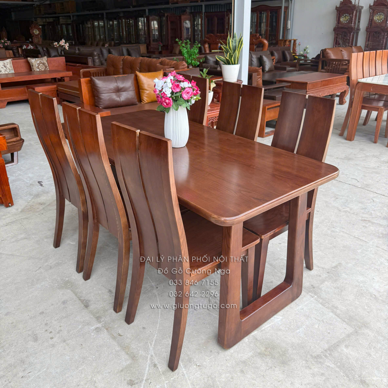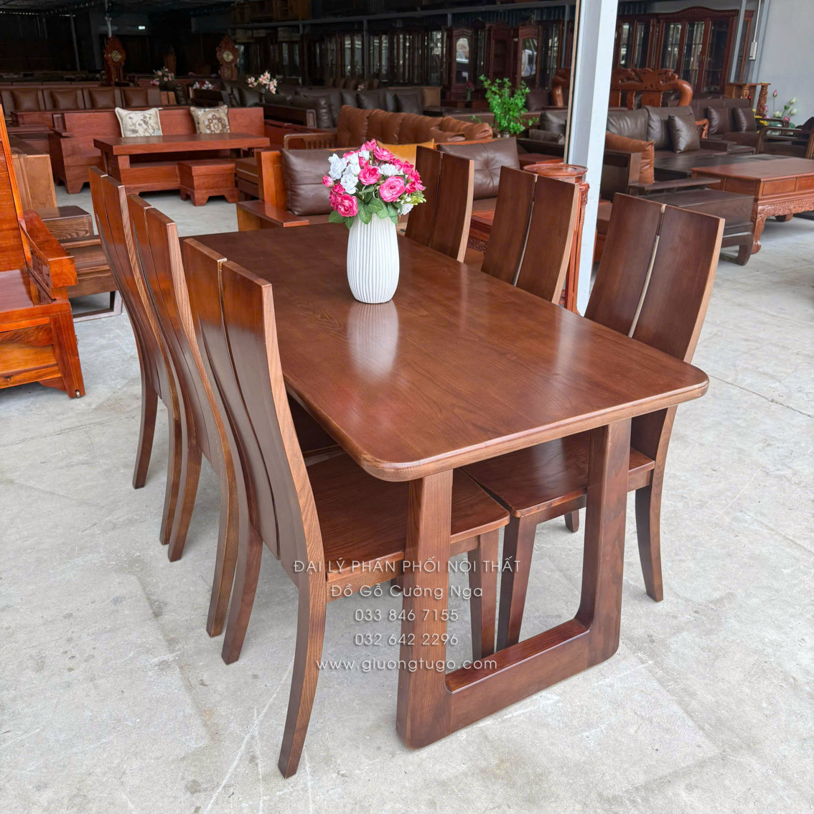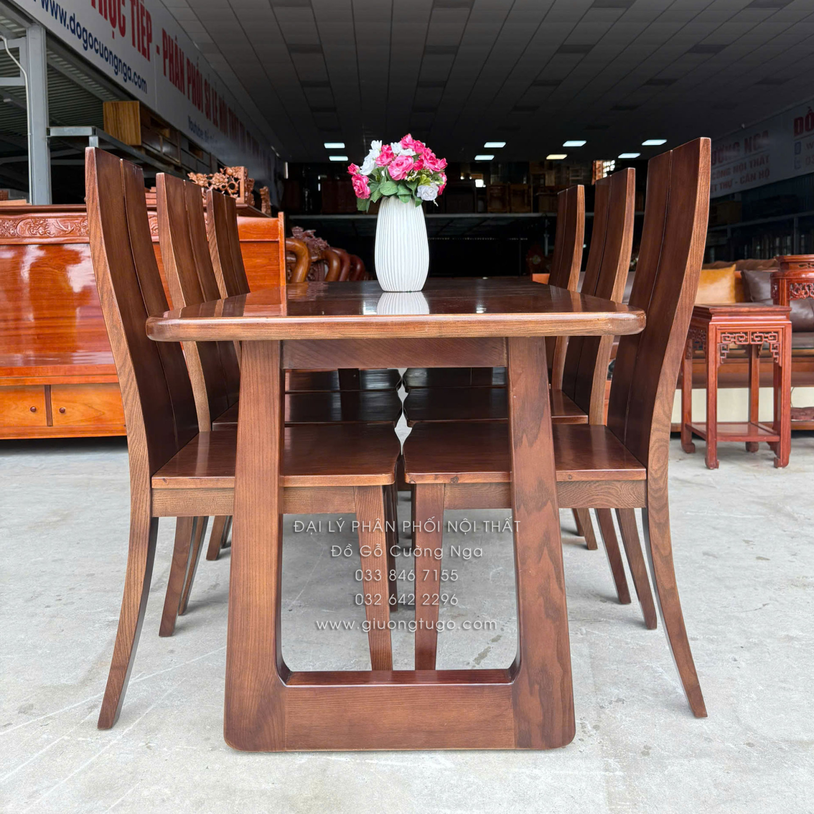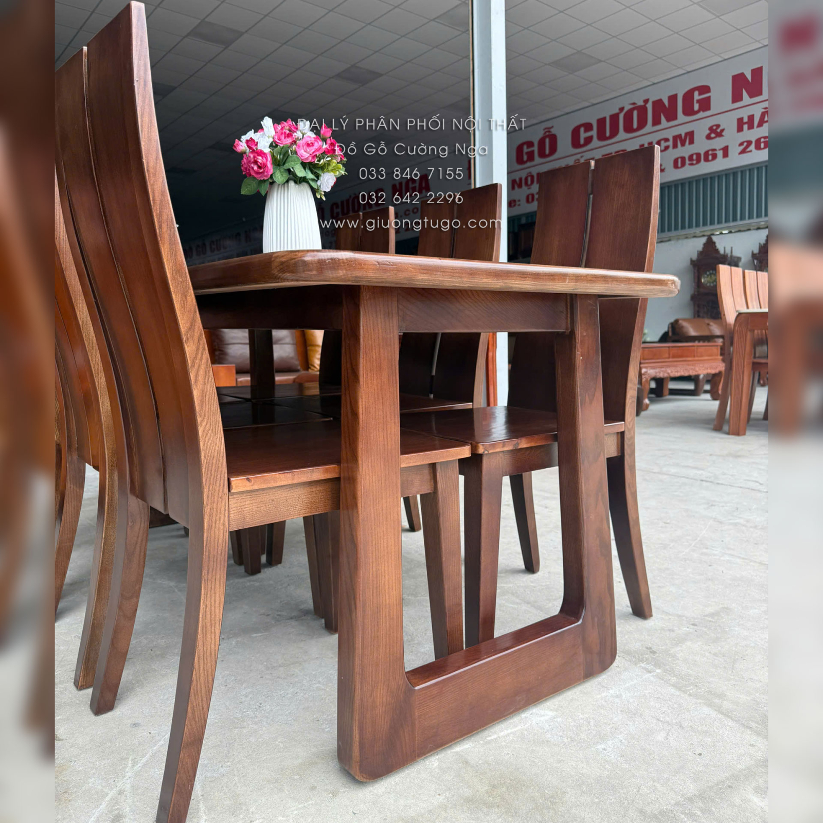 Bàn Ăn Gỗ Sồi Nga 6 Ghế Màu Óc Chó - Mẫu Chân Choãi - Mặt Bàn Gỗ