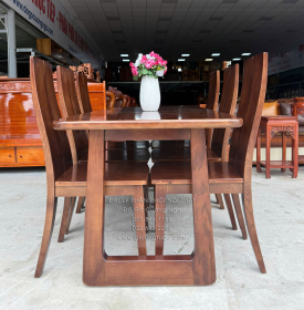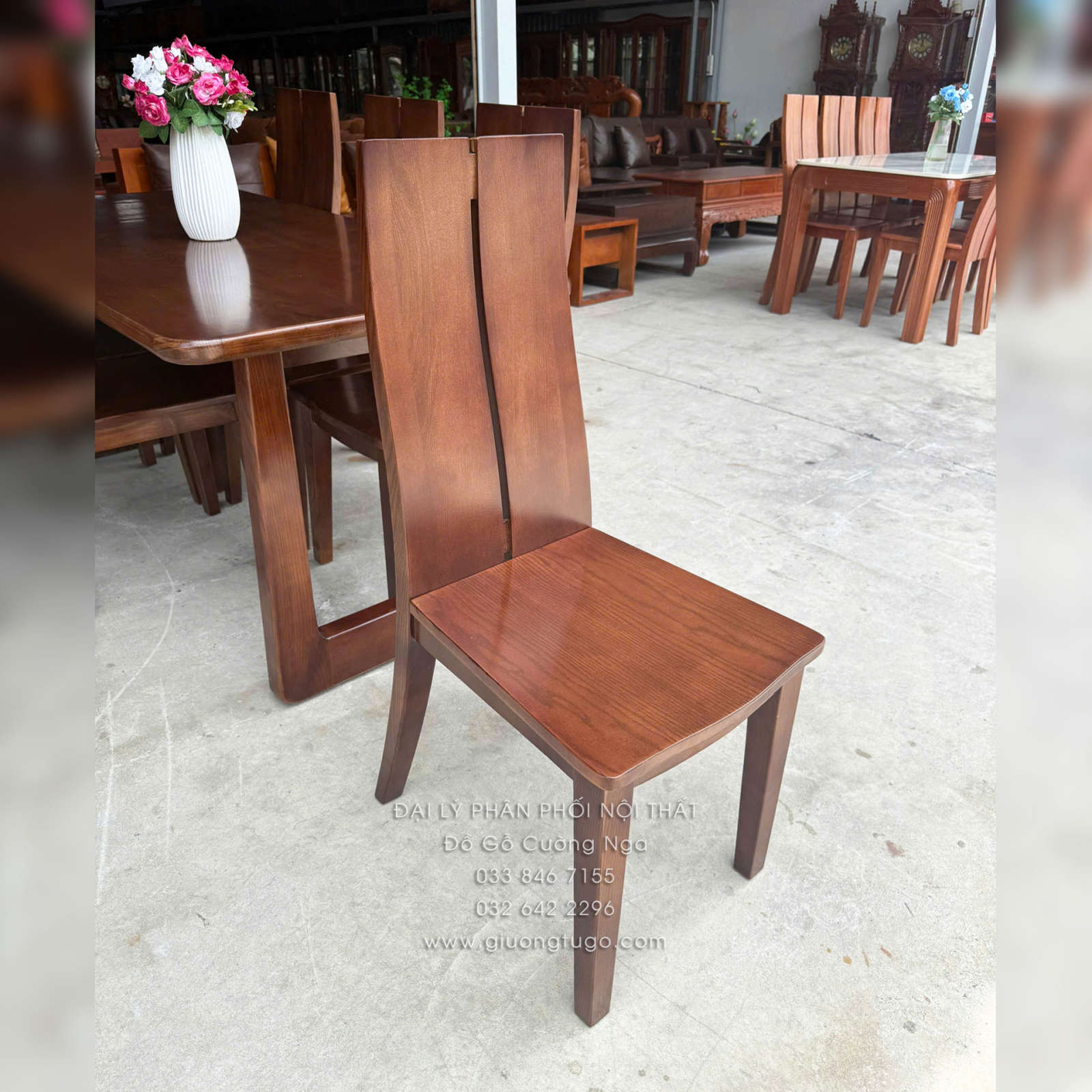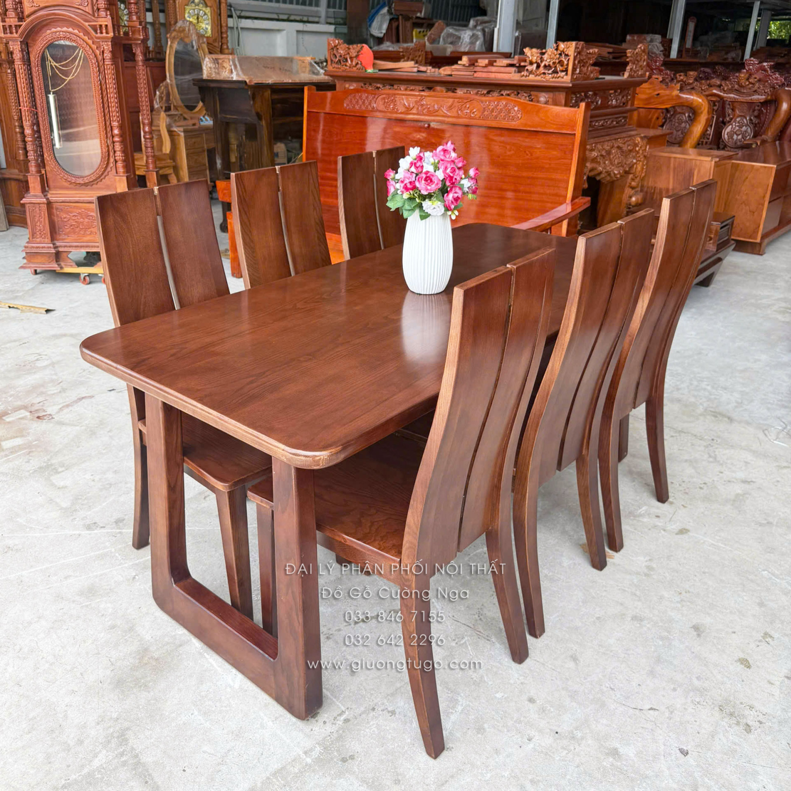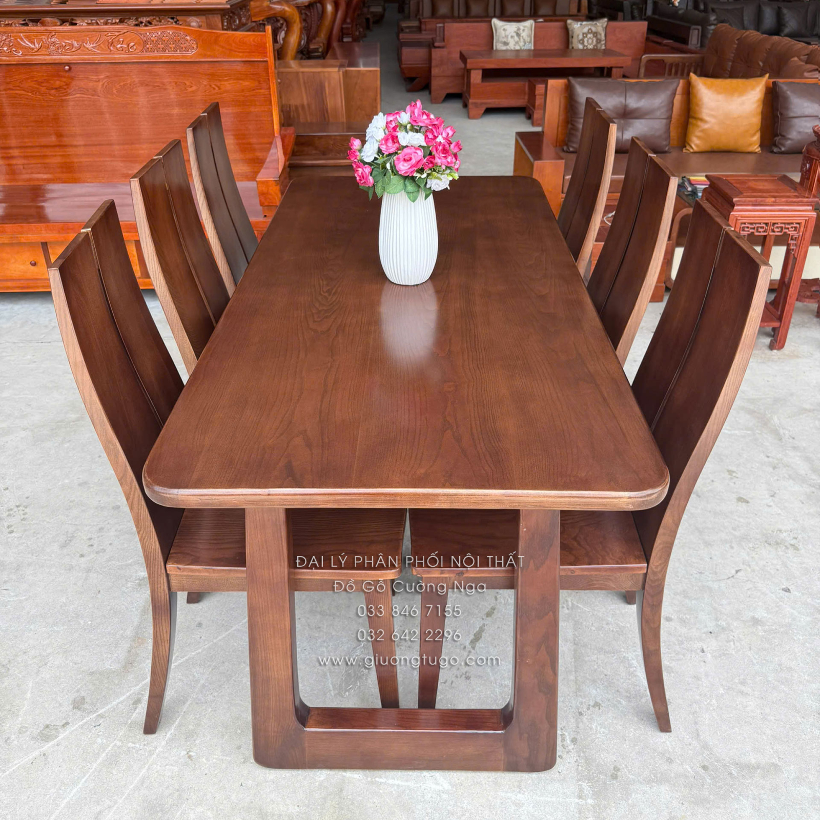 Bàn Ăn Gỗ Sồi Nga 6 Ghế Màu Óc Chó - Mẫu Chân Choãi - Mặt Bàn Gỗ