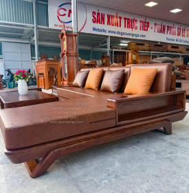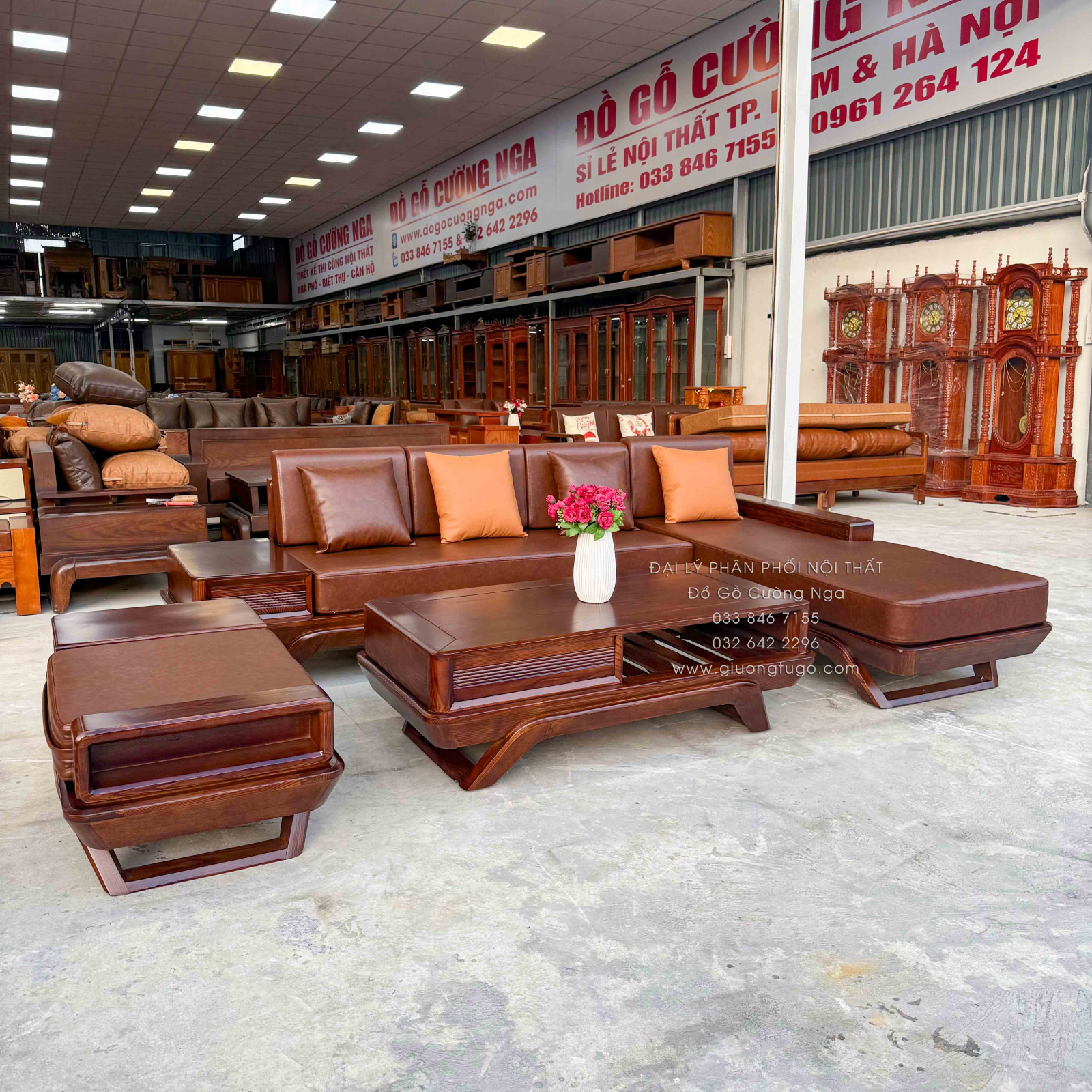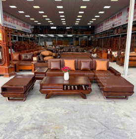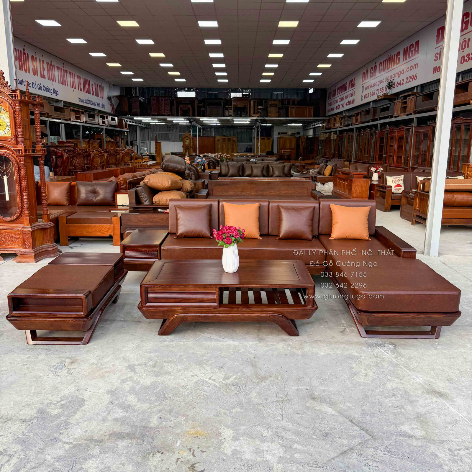 Sofa Gỗ Hương Vàng Góc L Chân Pháo Cao Cấp 3m2x2m15 Mẫu Nệm Da Sáng