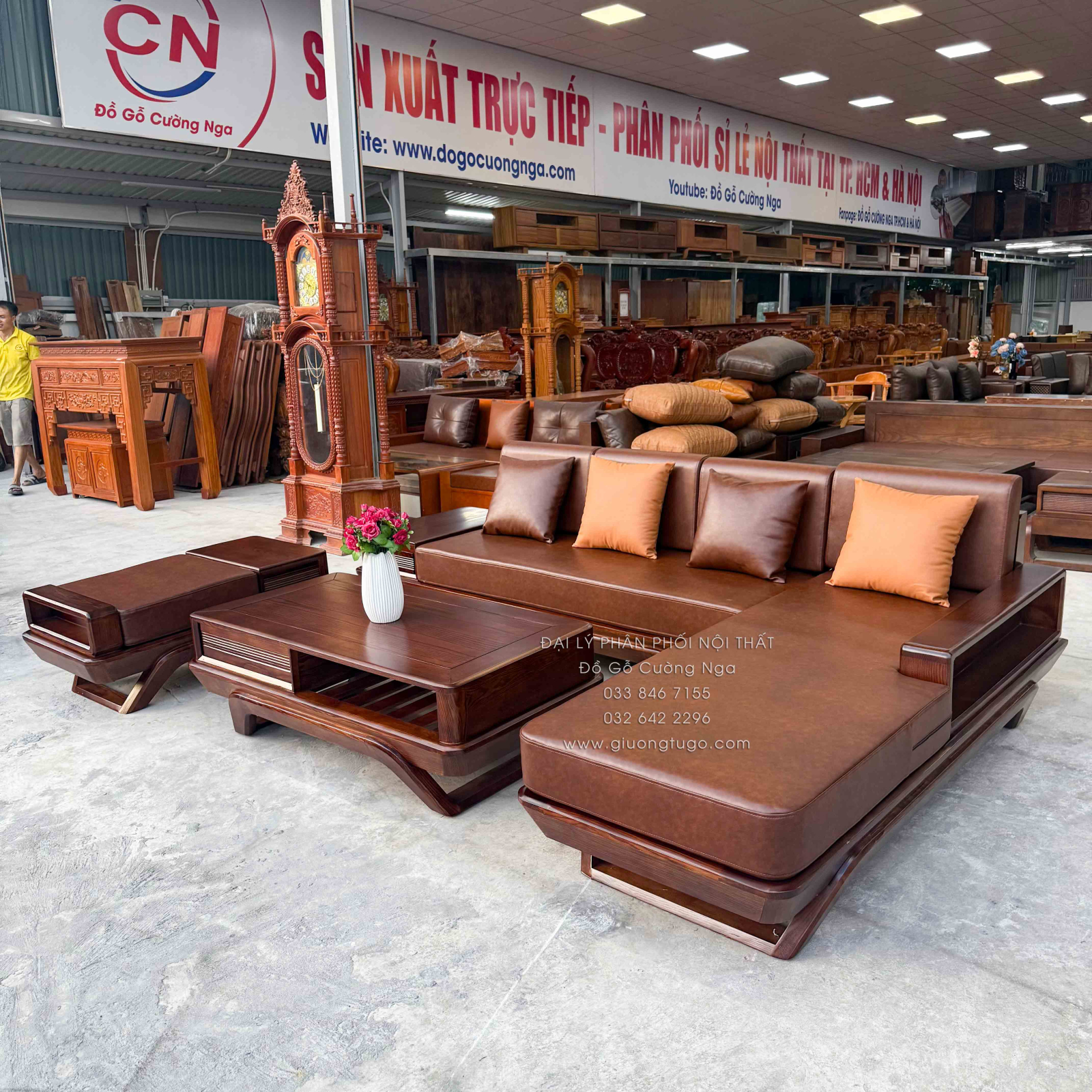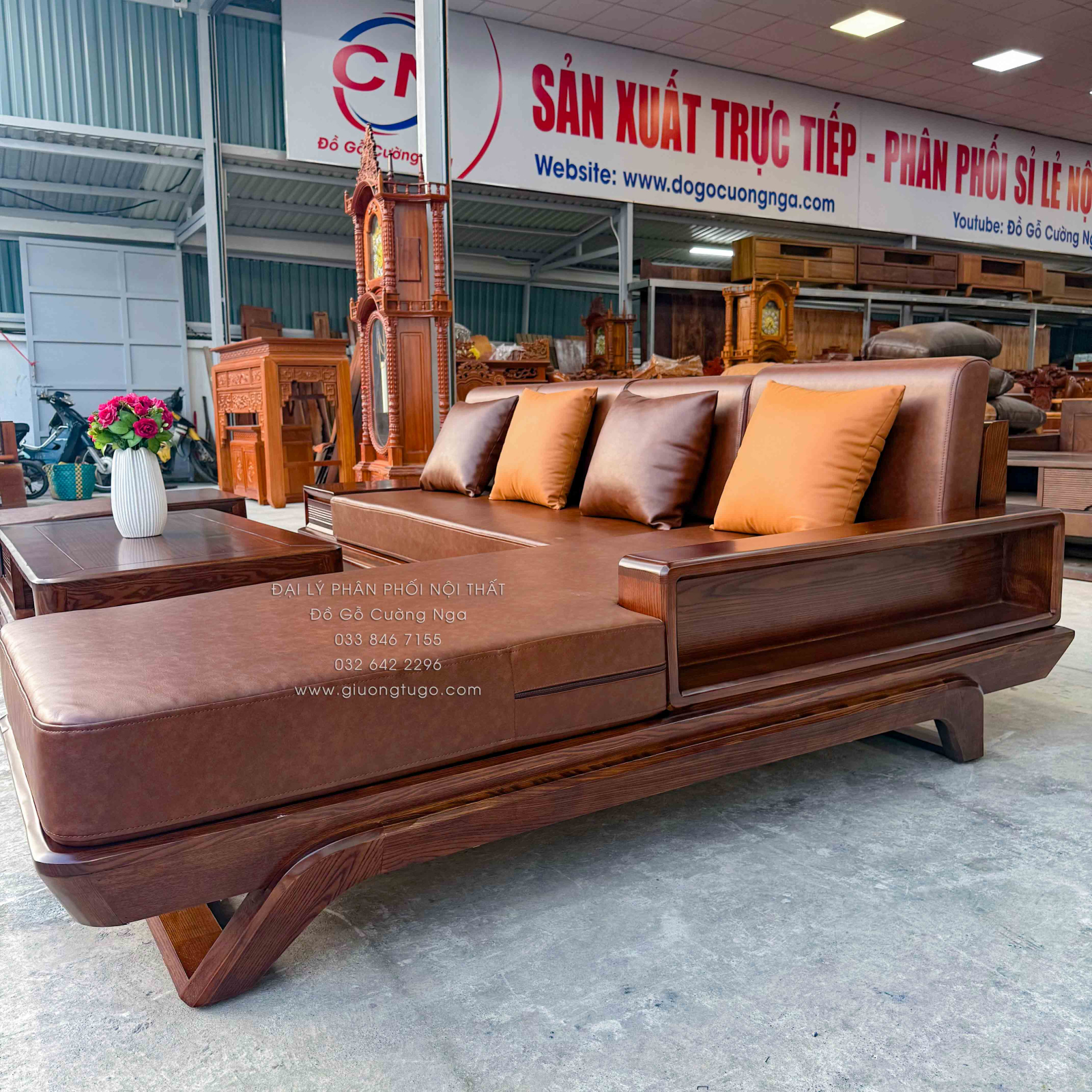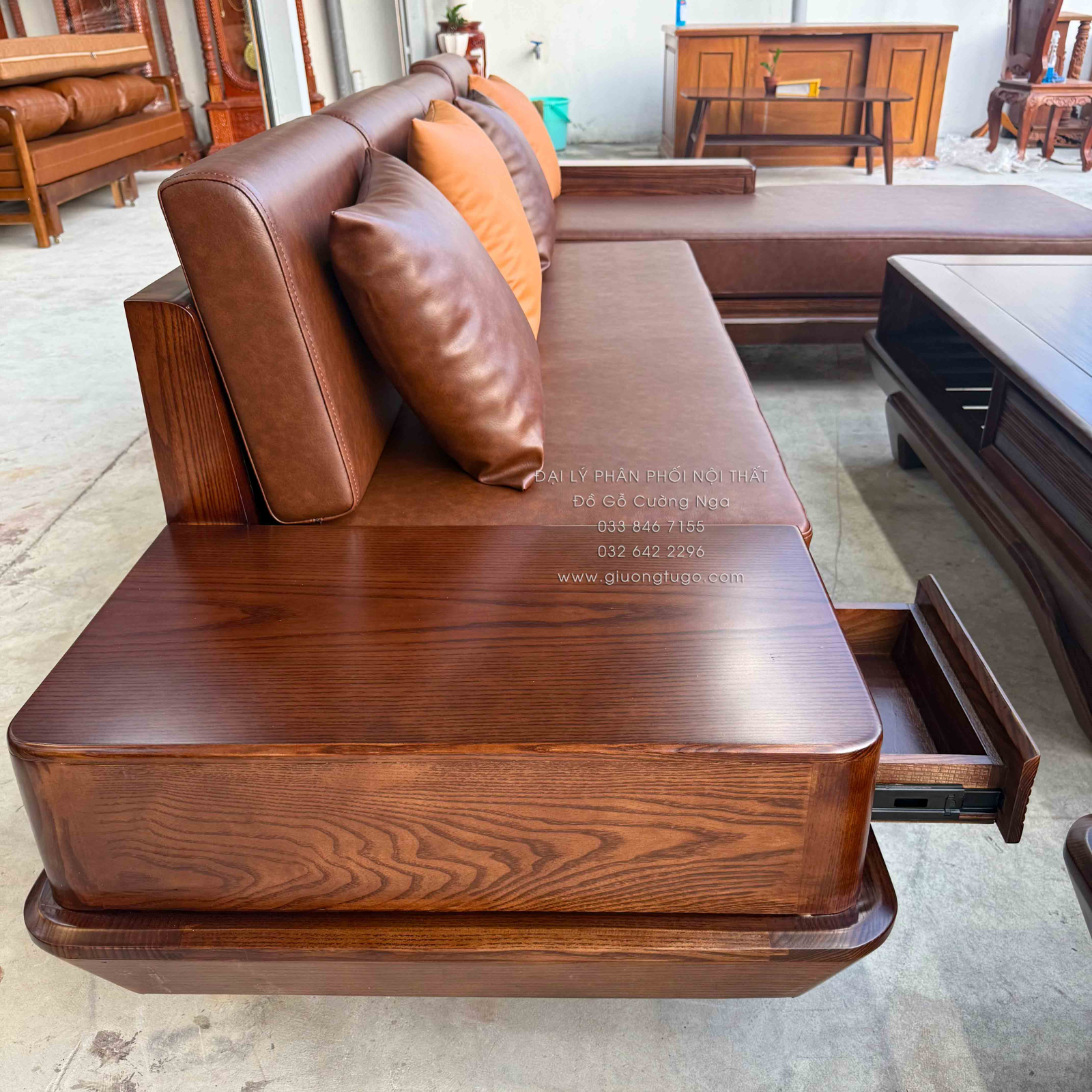 Bộ Sofa Gỗ Sồi Nga Góc L Chân Thuyền 2m8x1m9 Màu Óc Chó Sang Trọng