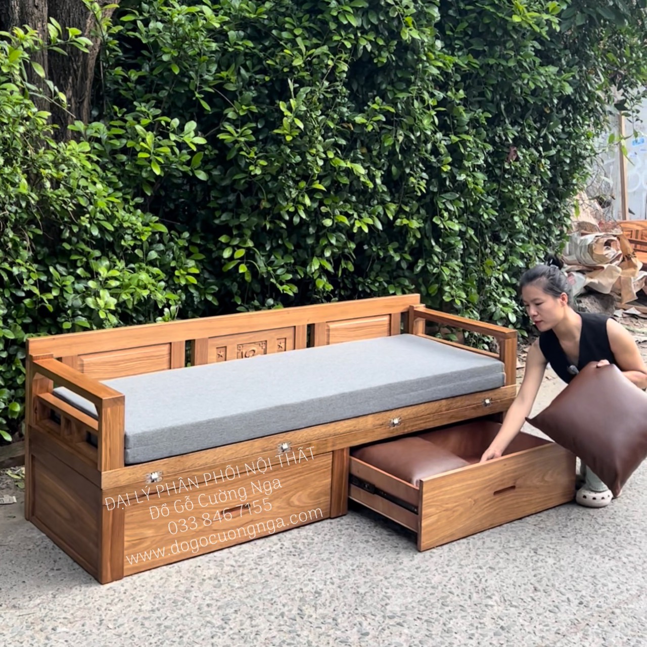 Ghế Giường Gấp Thông Minh Gỗ Hương Xám 2 Ngăn Kéo Kèm Nệm Cao 45cm