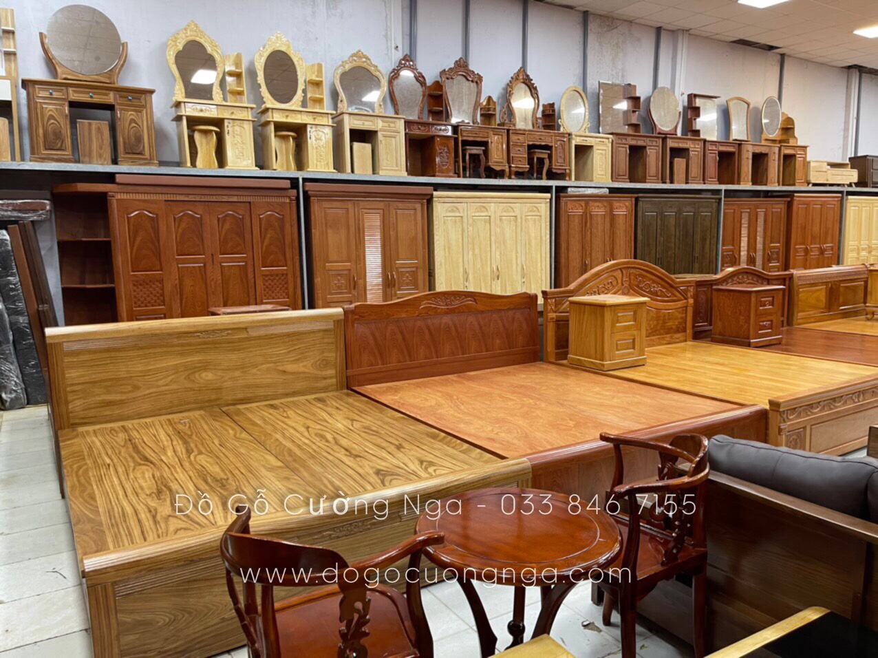 Giường Gấp Gỗ Xoan Đào 2 Ngăn Kéo Kèm Bàn (Có Kính) & Đôn Gỗ Sồi Bền Đẹp