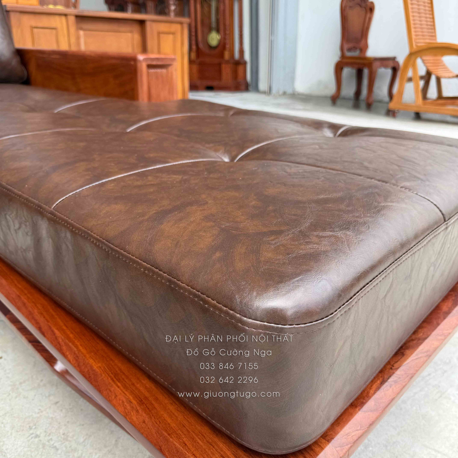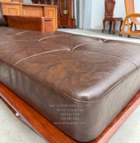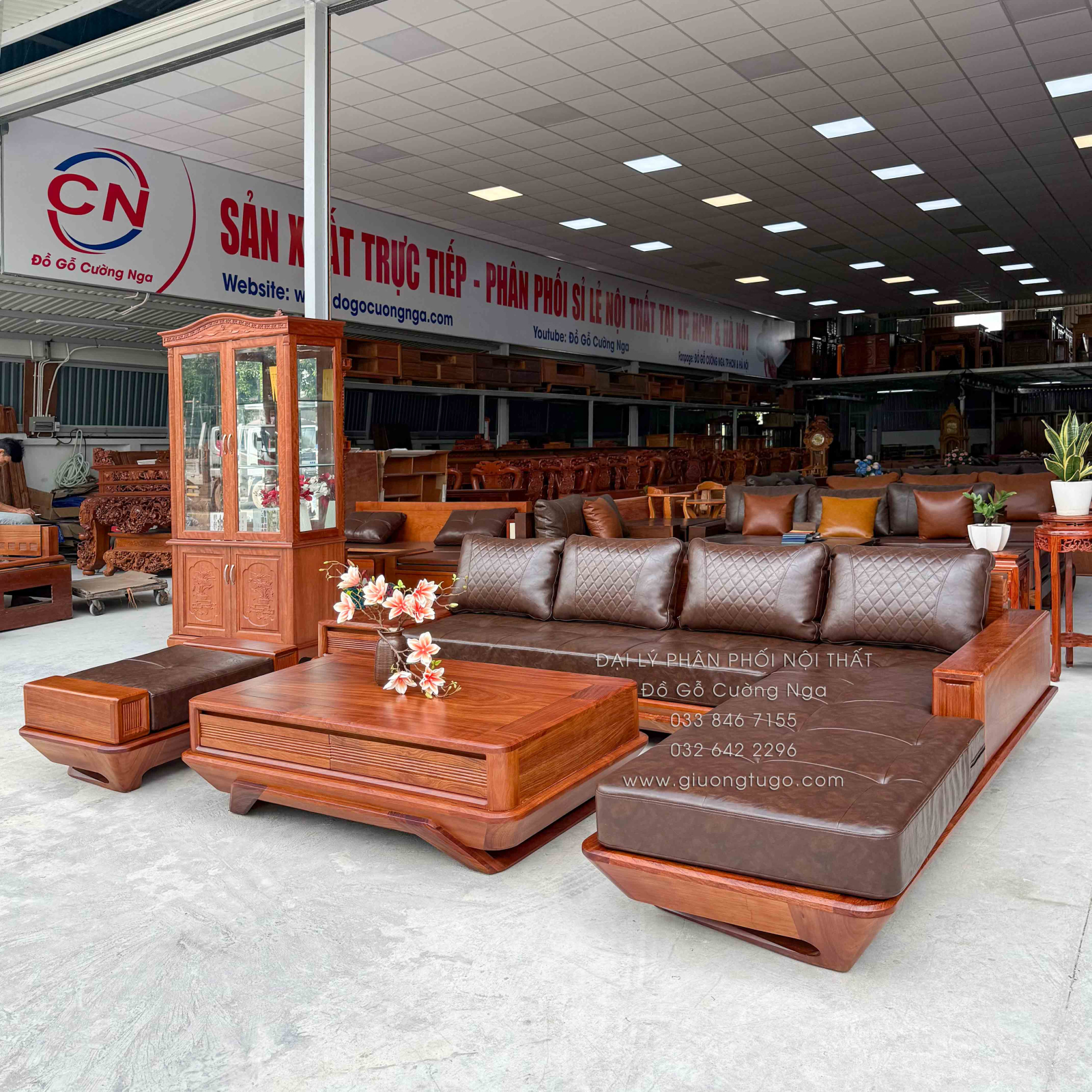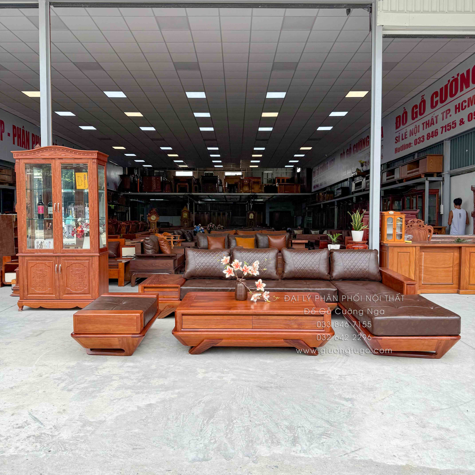 Sofa Gỗ Hương Vàng Góc L Chân Pháo Cao Cấp 3m2x2m15 Mẫu Nệm Da Sáng